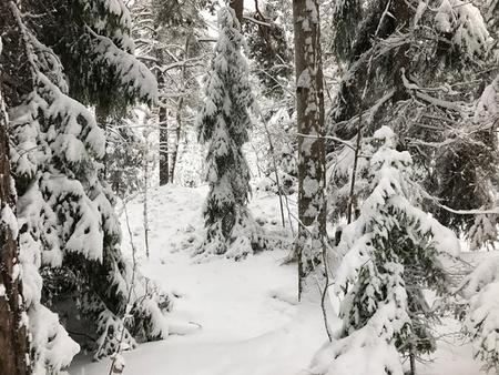 Tungt lägger sig snön på träden, det knakar ibland och många träd mister en och annan gren, särskilt tallar brukar få sina grenar knäckta. Granen rakt fram verkar ha fällt in sina grenar.