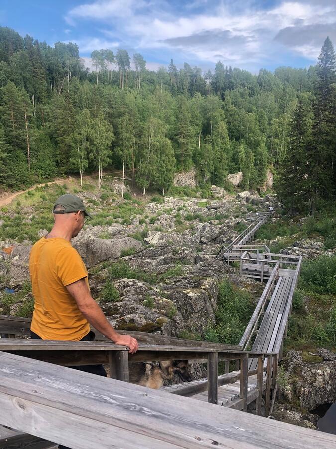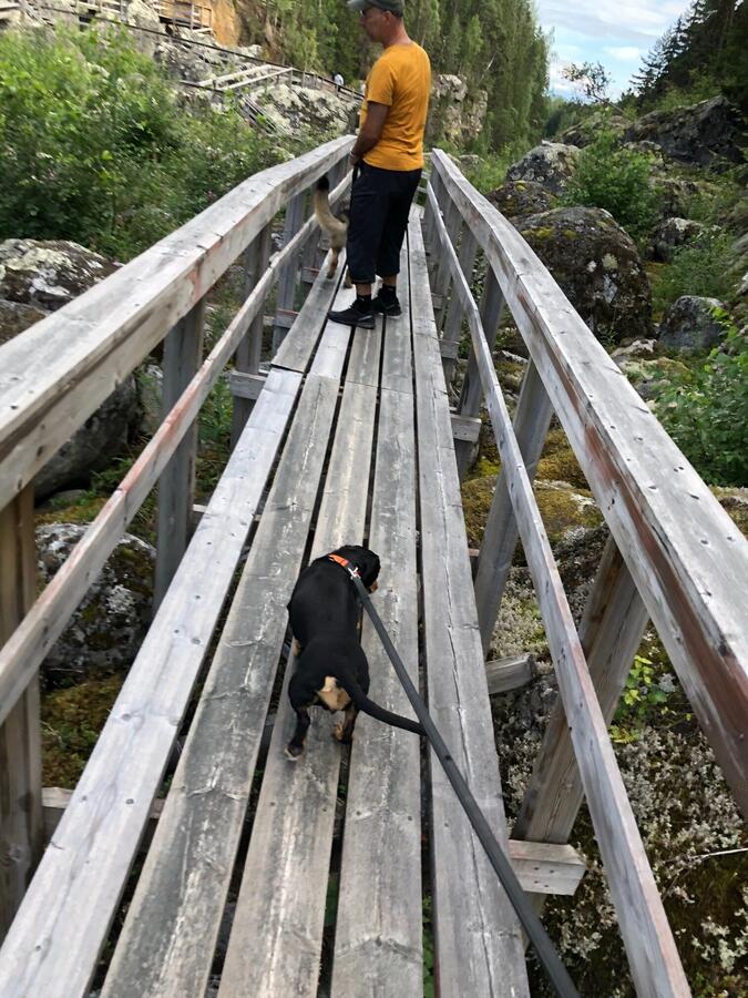 Trärampen har räcken på båda sidor längs hela sträckan och vi vandrade hela rundan med våra två hundar Zingo och Norma. Det var inget problem att vandra sträckan med hund. I alla fall inte om hunden är som våra hundar och inte alls bryr sig om andra människor eller hundar.