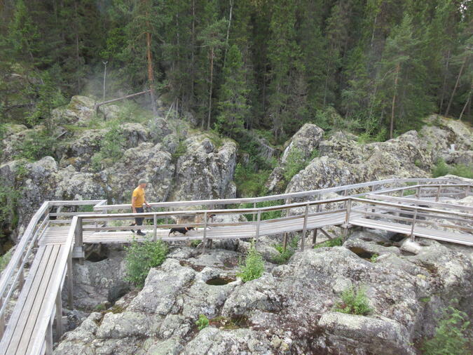 En lång träramp leder genom den torrlagda älvfåran och ger en fin vy över området.