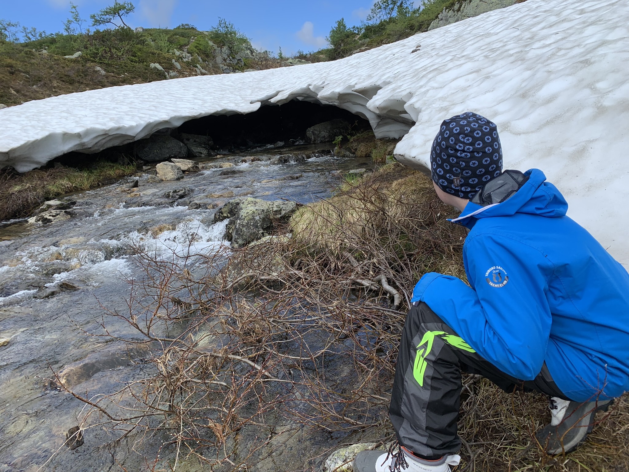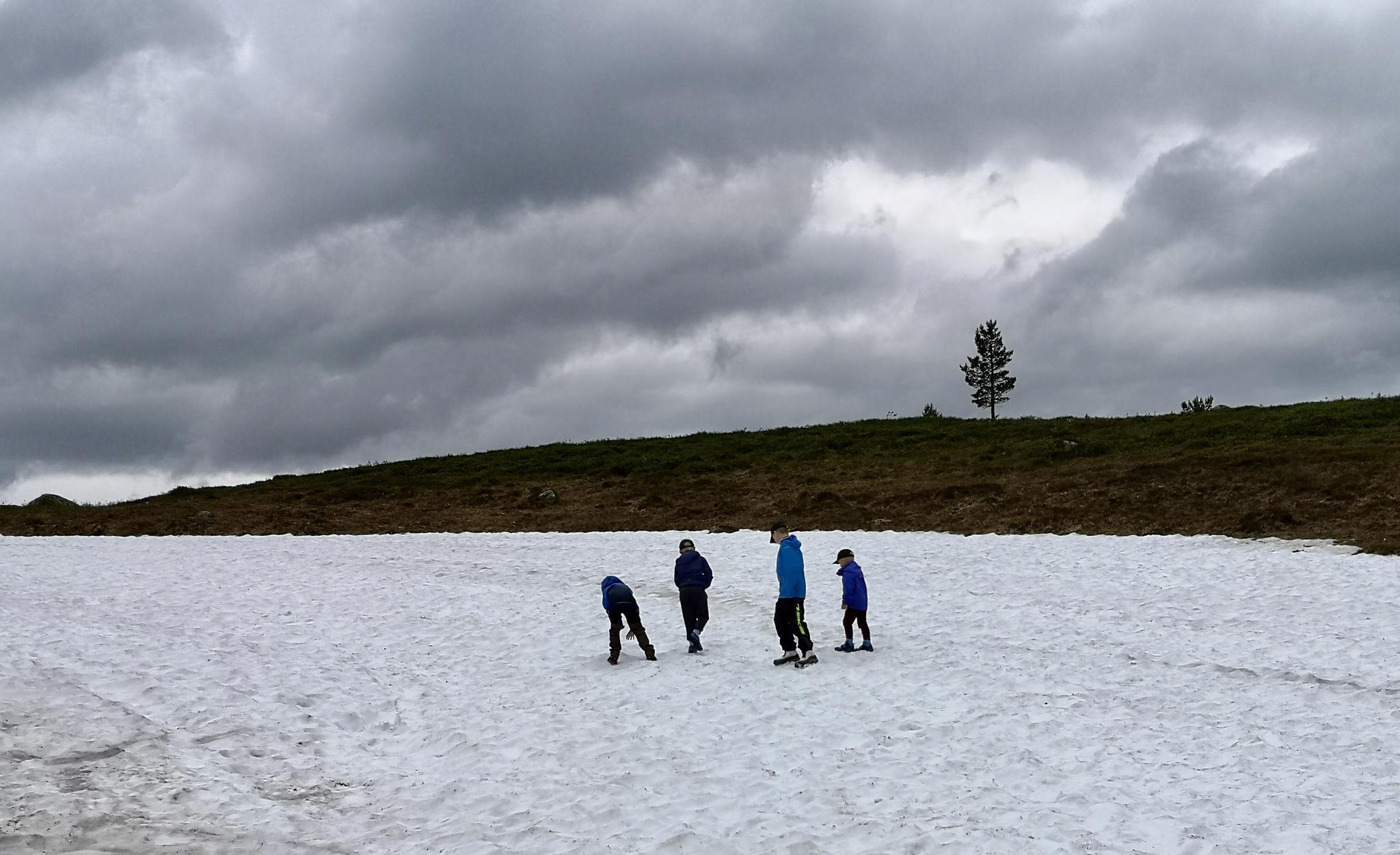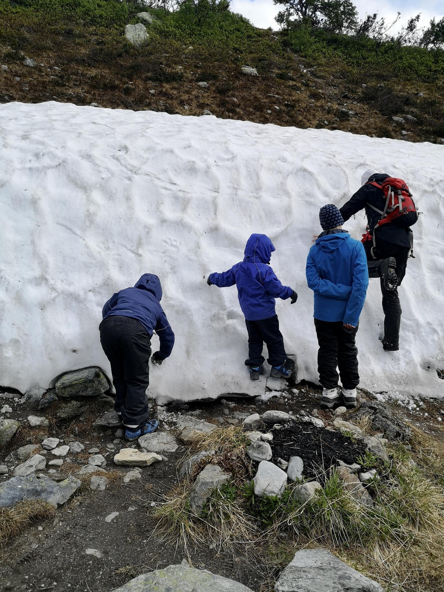 En bit upp på fjället hittade vi snö igen! Lika kul den här gången. Nu hade regnet upphört så det passade bra med lite fika för att fylla på energin i korta ben.