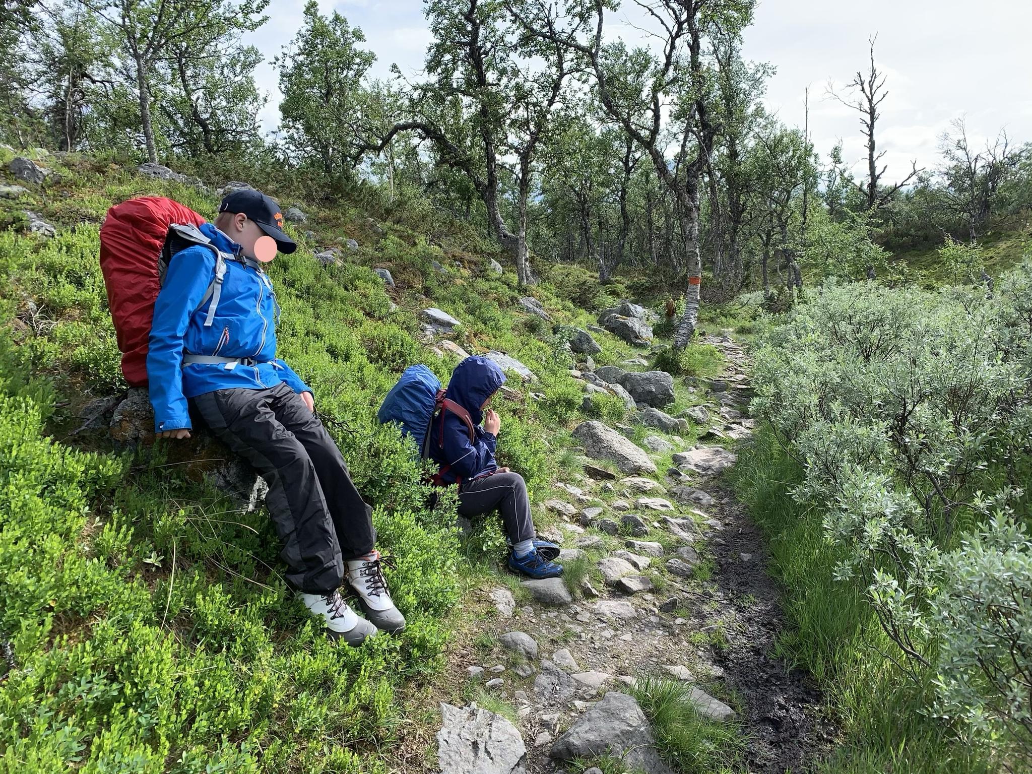 Vid leddelningen valde vi att gå den södra vägen mot Silverfallet, genom det som var markerat med mer grönt på kartan. Jag håller med sonen: ”den här vägen behöver vi aldrig mer gå igen!” Upp och ner för en mängd små kullar, oftast med stenar som fällde små fötter. Och när regnet av och till slutade så dök det upp flygfän som bet. Det var tur att barnen hade packat vandringsgodis lättillgängligt - det behövdes...