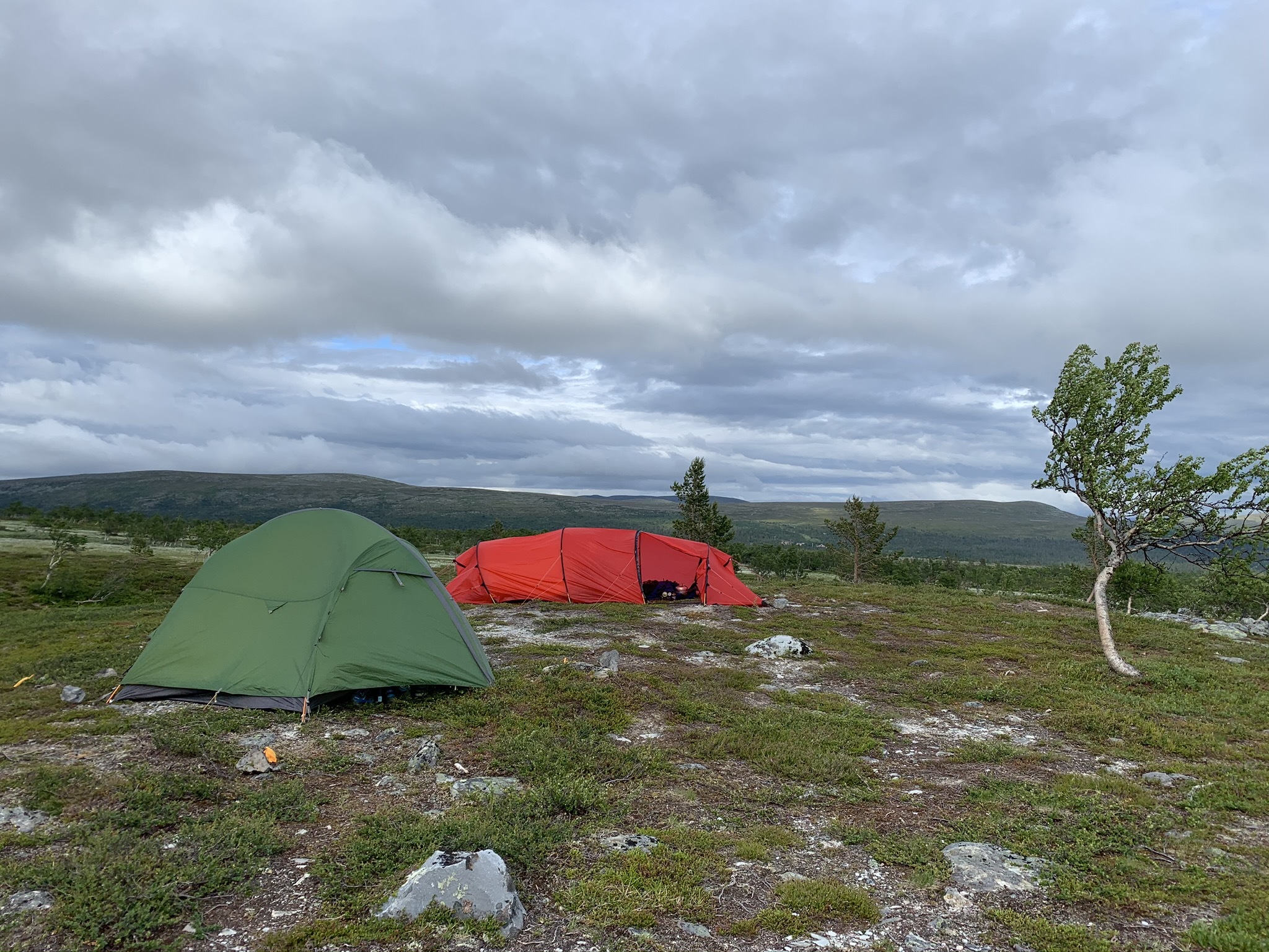 På eftermiddagen började det blåsa något, framemot kvällen friskade det i. Vi letade reda på några stenar att lägga på tältlinorna till vännernas tält, kändes säkrare så... Vinden slet och drog i tältduken men mina barn somnade som vanligt utan problem. Blev därför lite förvånad när dotterns vän gråtande krafsade på tältduken och bad om att få komma in. Deras kupoltält hade vikt ner sig på vindsidan och lagt sig över honom. ”Finns det tornados på fjället? Kommer vi att blåsa bort nu?!” Efter att ha försäkrat honom att ”det här kommer att gå bra!” och stuvat ner honom mellan mina barn så var det bara att få på sig kläderna och ge sig ut och försöka få stadga i deras tält på något sätt. Fler stenar, spänna linor...så! Regnet, blåsten och den sena timmen gjorde att det inte blev någon bild tagen. Den nedan är tagen på morgonkvisten och visar inte riktigt natten dramatik. Man kan dock ana vinden i björkens grenar.