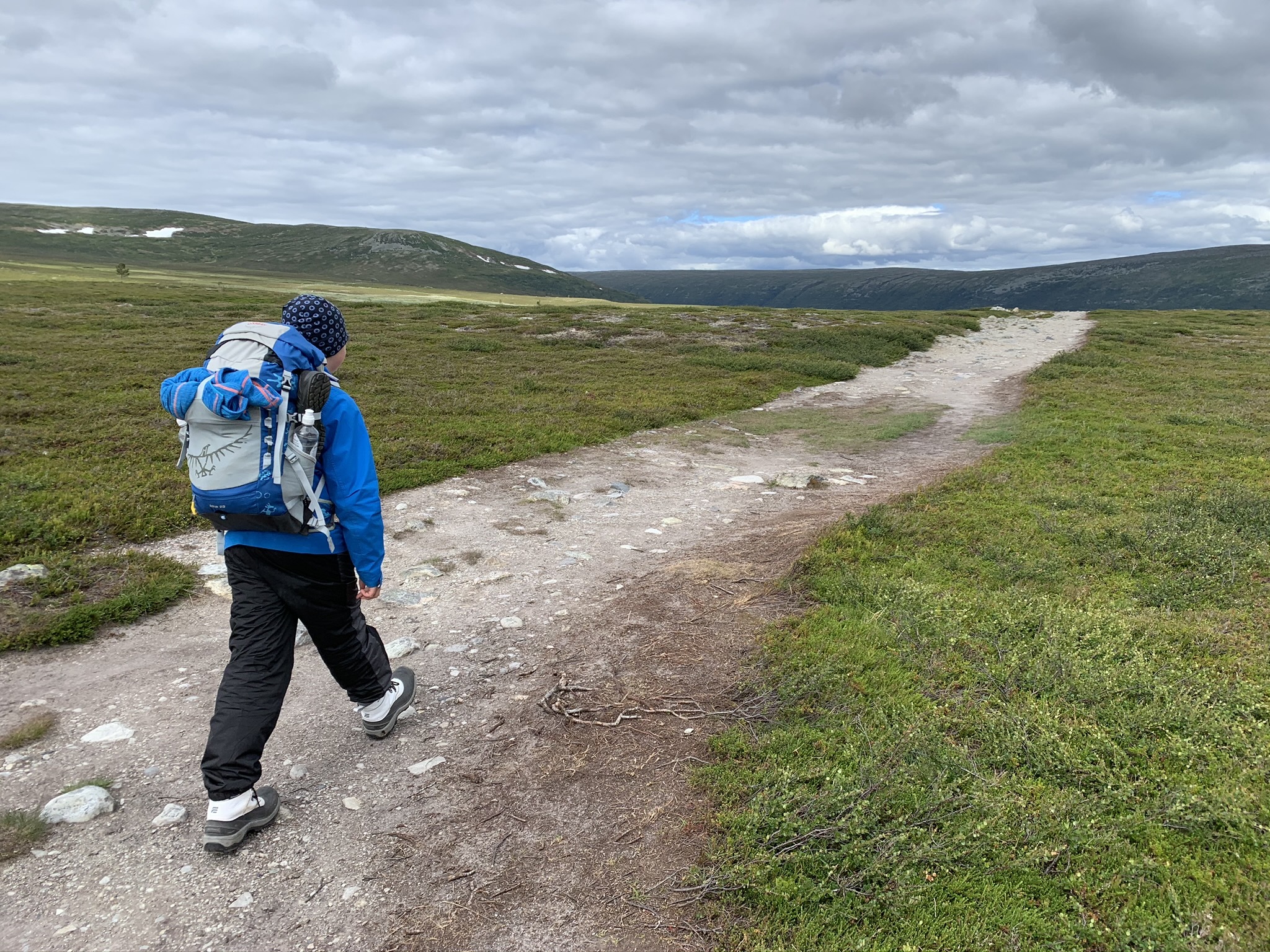Vädret hade nu ändrat på sig rejält från första vandringsdagarna. Då shortsväder, nu snöade det på dottern vid morgontandborstningen! Nu kom underställ, vantar och mössa väl till pass. Den här vandringen kom verkligen alla de där ”bra att ha om vädret vänder”-kläderna till användning.