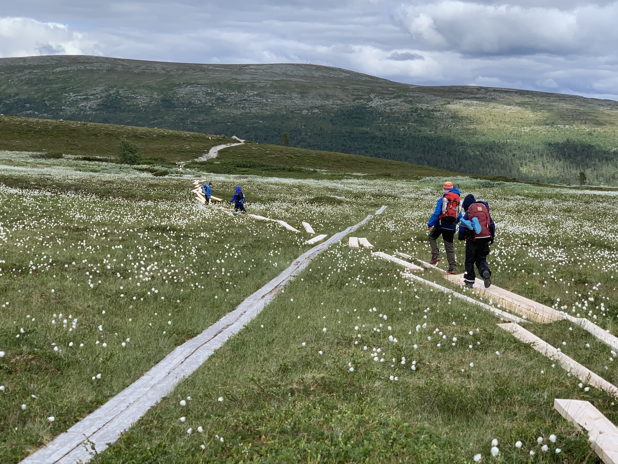 Att någon sedan lekt plockepinn med nya spänger gjorde vandringen klart mer fantasieggande för barnen. Vem orkade bära upp plankorna hela vägen? Ska man gå hit och dit? Och kolla vad många ”blåsblommor” det finns!