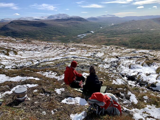 När det nästan var mer snö än barmark och vi bedömde att vi hittat sista jokken innan toppen tog vi paus för lunch. Utsikten var fantastisk!