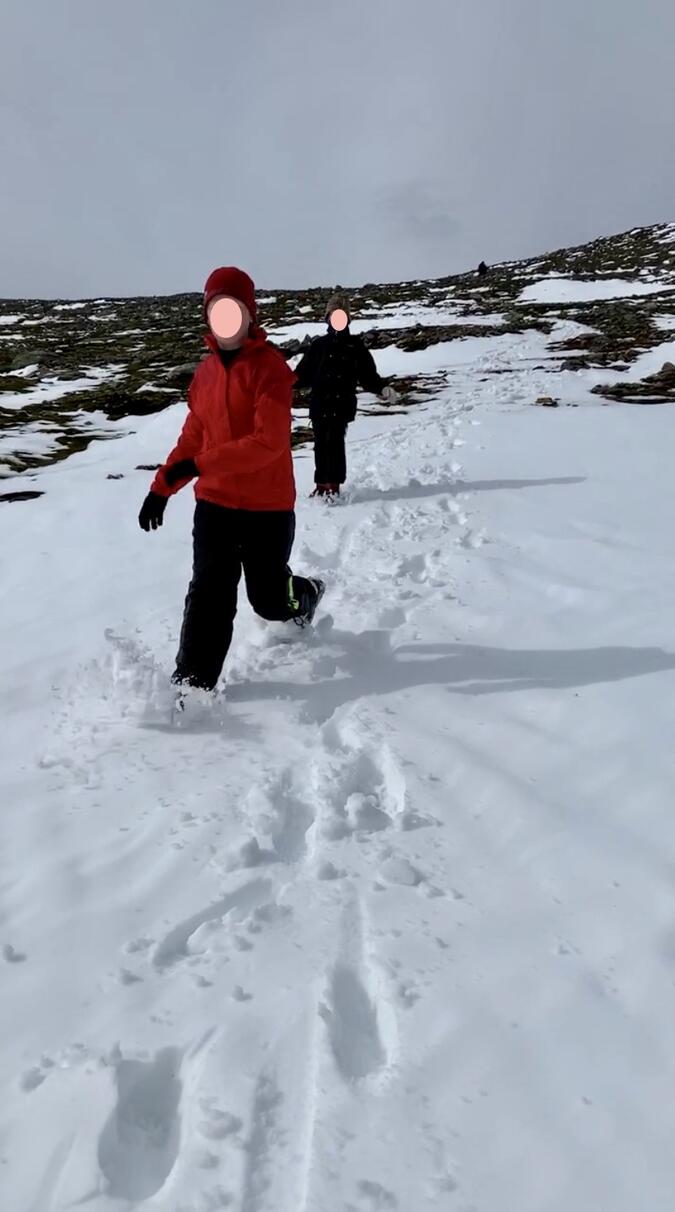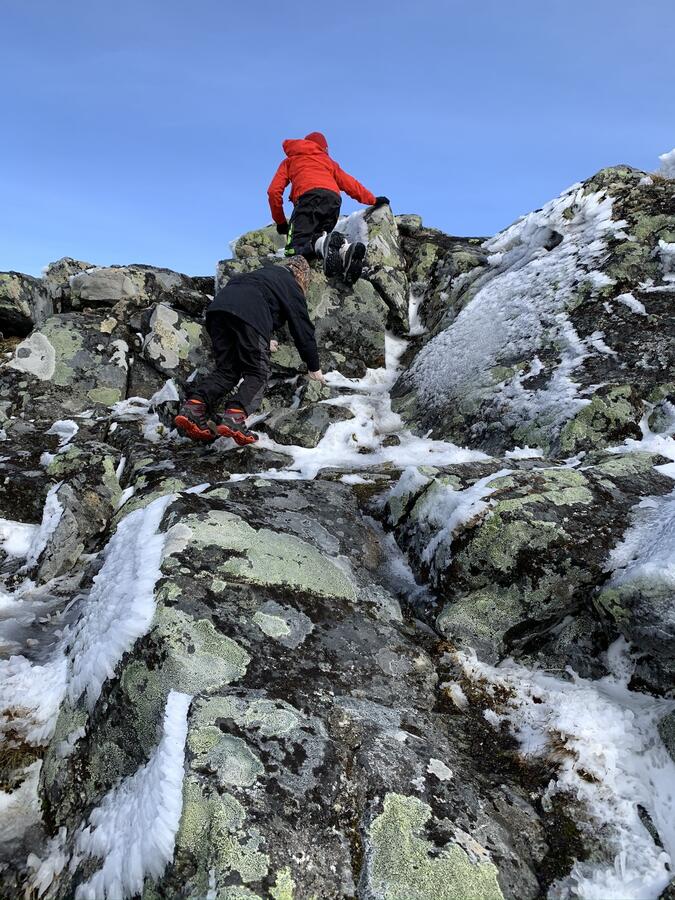 Så var det dax för sista biten upp till toppen. Barnen konstaterade snabbt att det nog skulle bli svårare än de andra berg de tagit sig upp på - snö och is gjorde stenarna mycket hala!