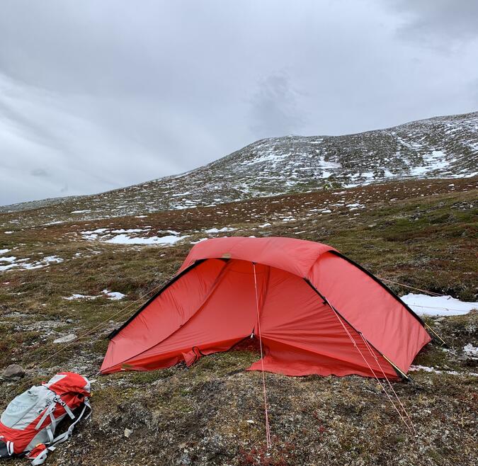 Det blåste ändå ganska så friskt en bit längre ner - då kom tältet väl till pass! Jag hade packat ner mitt första tält; ett Niak från Hilleberg, inköpt -99 och fortfarande i fjällvandringsdugligt skick. Det blev lite skevt på den ojämna fjällsluttningen men efter den ständiga blåsten njöt ändå vi av lä, varm choklad och mjuk pepparkaka inne i tältet.