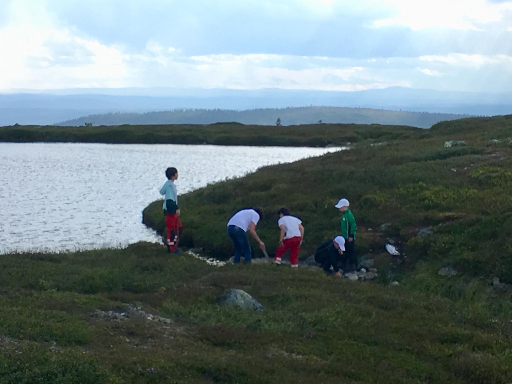 Väl framme fick vi leta en stund för att hitta två större platser utan rötter och stenar. Skönt att barnen kunde sysselsätta sig under tiden med att bygga en övergång mellan två av sjöarna.