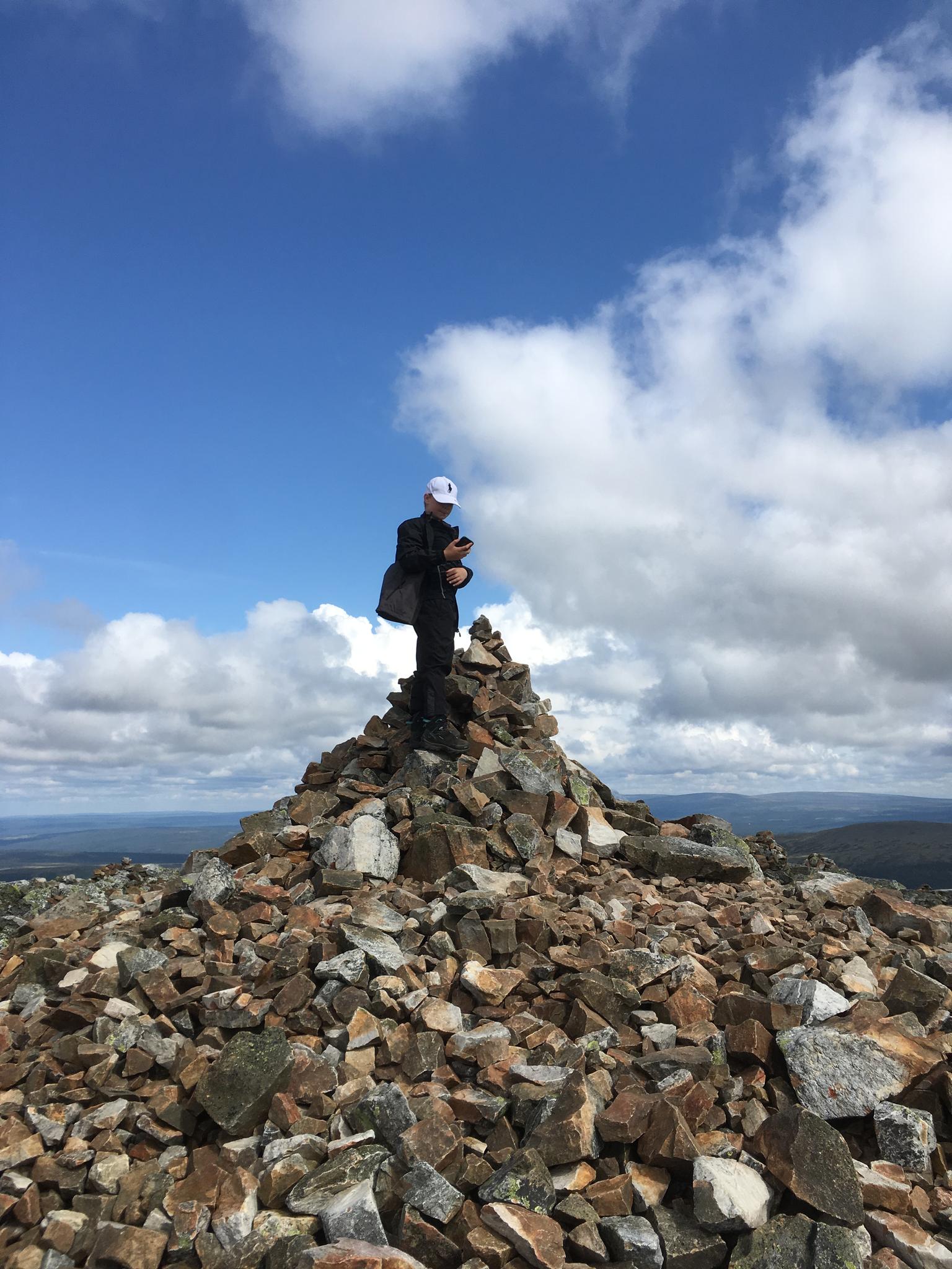 Med ny energi tog vi oss an den sista biten upp till toppen. Och så...äntligen uppe! Härlig utsikt och en jublande känsla av "jag klarade det!" Det behövde ju pappa få veta och här var det inga problem med mobiltäckningen. Efter firande med choklad och smågodis gav vi oss av ner mot tälten igen.