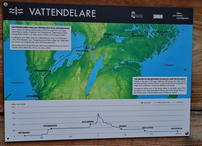 När vi lämnar Ramundeboda bakom oss har vi närkontakt med E20. Efter bara ett par hundra meter leds vi ut på en stor rastplats längs europavägen. Det kan vara bra att veta att här finns toaletter. Stanna gärna till och läs på informationsskyltarna. Speciellt skylten som handlar om vattendelaren är intressant.