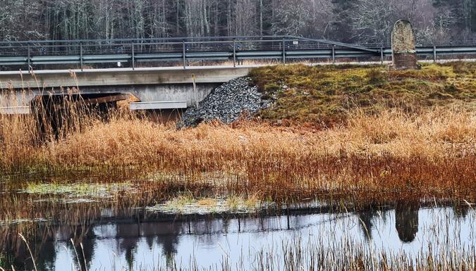 Efter ytterligare något hundratal meter för oss leden längs en äldre vägbank – cirka 120 meter lång. Där Sågdammsån rinner under E 20 finns en minnessten med följande inskription: