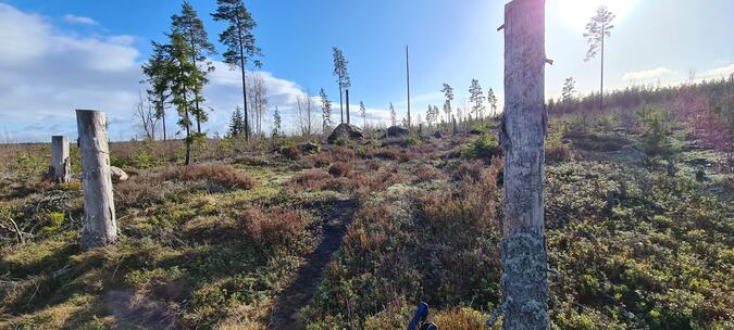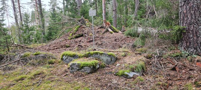 Någon kilometer efter Tjyvastenarna passerar stigen först en och sedan en till gammal informatiosskylt som numera är helt oläsliga. Jag blir så otroligt nyfiken på vad som kan ha stått här. Möjligen kan det ha handlat om kolbottnar och kojruiner, för i detta område finns ett antal mycket tydliga och fina sådana.