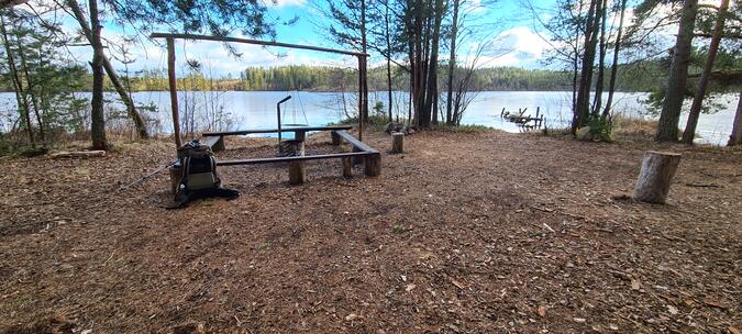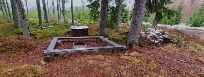 Strax efter timmerrännan viker eden av söderut. Här finns en eldstad med bänkar runt som kan locka till en rast.