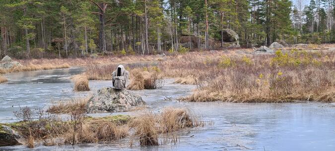 200 meter vidare längs vägen kan man se en liten figur som hukar ute på en sten i våtmarken. Så vitt jag vet slutar konstrundan här.