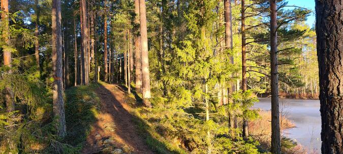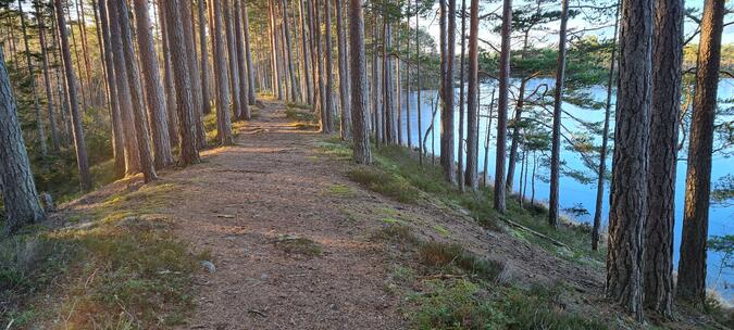 Uppe på Kråksjöåsen passerar leden flera sjöar, bland annat den lilla Aborrtjärnen där leden är som allra vackrast.