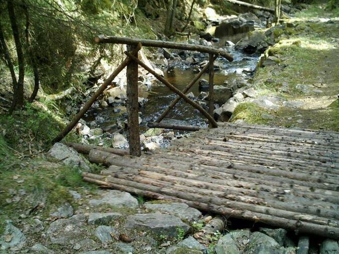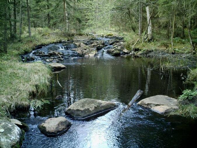 Idag är vädergudarna med mig, solen lyser och temperaturen är behaglig. Bara ett fåtal lätta moln syns på himlen när jag tar de första stegen på stigen, väcker säkert de små trollen och vättarna till liv. Ska bli spännande. Jag går in i en rik löv och barrskog, friska dofter sveper över mitt ansikte, alltmer grönska börjar bli synlig efter vintervilan. Bäcken på min högra sida och det dröjer ej många minuter innan jag går under några omkullvälta granar och kommer sedan fram till en liten bro, bäcken skiftar sida.