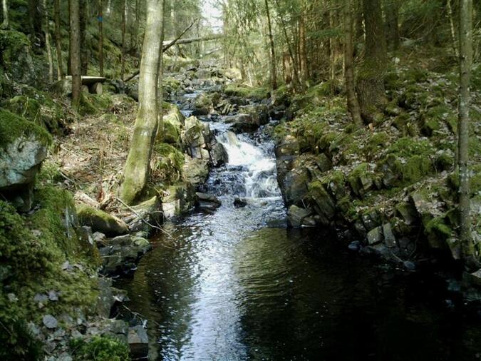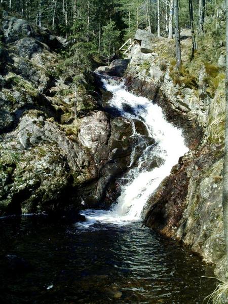 Jag blickar upp lätt förvirrad, blir påmind om att det ej är skönt att för länge sitta på en stenhård bänk. Alltid lika upplyftande att då och då stöta på platser som väcker det omedvetna lite extra men vill/kan ej stanna längre, benen vill vidare. Stigen kränger nu ner i en alltmer mer sluttande terräng och ljudet ifrån bäcken ökar successivt, jag undrar vad jag kommer få att beskåda härnäst. Svaret kommer efter ett par minuter då jag först rundar en halvmåne bro innan man kommer ner till skinnarsågsfallet som är ett utav Kilsbergens högsta med en fallhöjd på ca: 7 meter, krafterna som vattnet avger har b.l.a används till kvarn och såg på 1700-talet. Detta tycker jag är stigens höjdpunkt då fallet är imponerande att beskåda ifrån alla väderstreck.