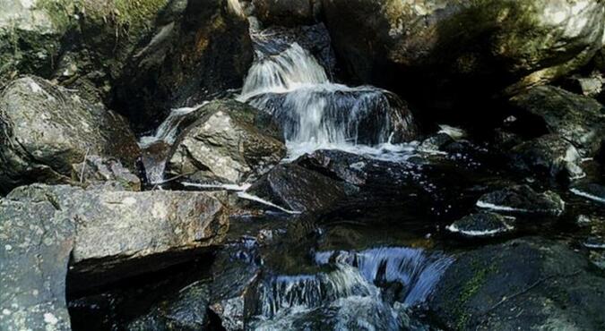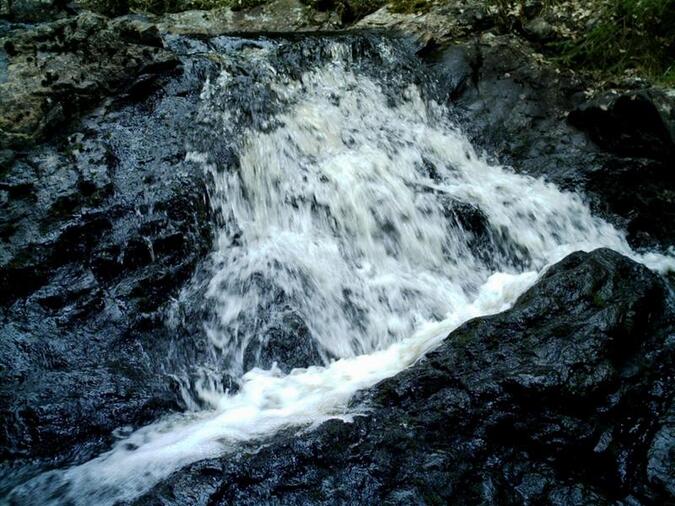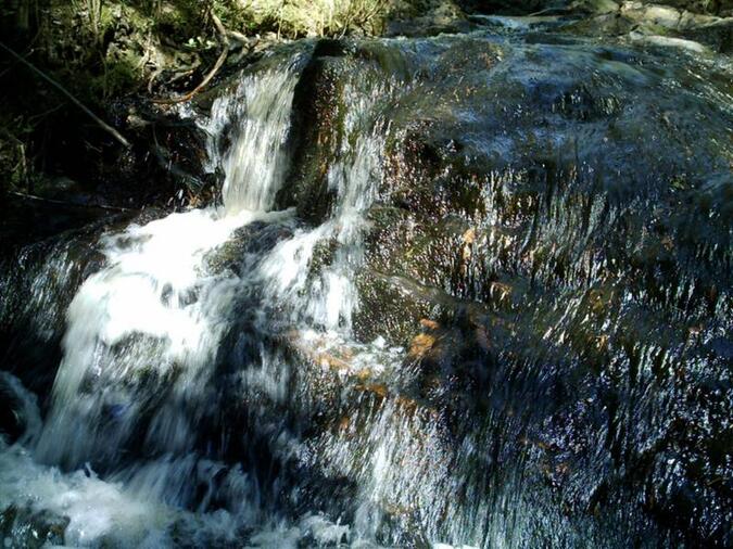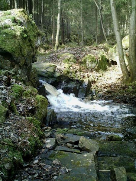Dess flöde blir lite lugnare och man kommer en bit ifrån, går över mark där det för länge sedan pågick verksamhet för framställning av kol, nästa bro är nu inom synhåll och jag stannar upp. Beskådar vattnet som slingrar sig som en orm igenom skogen, bryter sig fram med sin okuvliga vilja, grenar som hänger över här och där, solen som reflekterar på sina ställen. Tar av mig ryggsäcken, tar några klunkar vatten, undrar samtidigt vad alla fåglar kommunicerar om? Passerar bron och nu ökar bäcken sin styrka. Mitt synfält intar en blandning av stora och små stenar, små dammar, brus, vilt forsande och skum, ändrar min position, går över på andra sidan för att få en annan vinkel, lyssnar, njuter, beskådar dess vilda framfart.