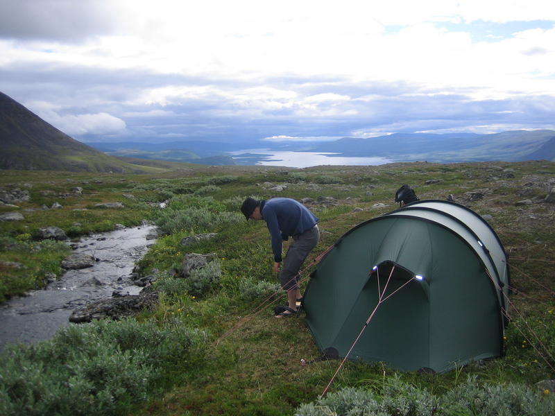 Vi hade två tänkbara tältplatser att välja mellan. Antingen skulle vi slå upp tältet vid någon av de första sjöarna man passerar på väg upp på Cievrraèohkka. Om orken var på topp och vi kände oss pigga fanns möjligheten att fortsätta ända fram till renvaktarstugan norr om fjället. Den orken fanns inte. Vi nöjde oss med att leta upp en acceptabel tältplats ganska snart efter det att stigen förirrat sig i intet. Magnus tyckte att tältplatsen var i knöligaste laget. Jag kontrade med att han skulle passa på att sova gott. Så här fina tältplatser skulle vi inte ha många nätter.