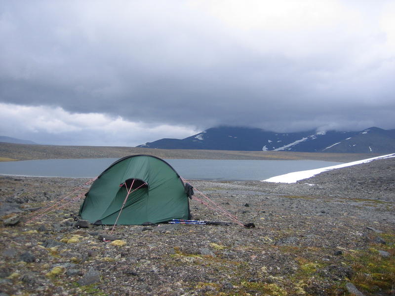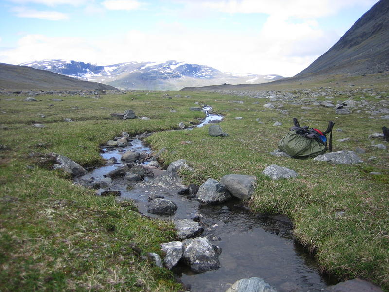 När vi kommit upp för den första branten visste vi att det skulle finnas gott om tältplatser, men bokstavligen hela dalgången - Siellavaggi - flöt av vatten. Var helst vi satte ner foten sjönk den i decimeterdjupt vatten. Inte förrän vi var framme vid en av sjöarna vid pasströskeln lyckades vi hitta en yta som var så pass torr att det bara kippade lite när man gick över den. I normala fall är jag helt säker på att det skulle ha vimlat av inbjudande tältplatser i denna dalgång.