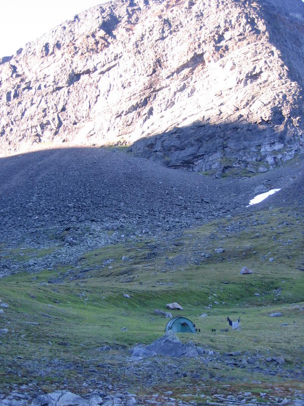 I jämförelse med tidigare dagars stigningar var klättringen upp i Måskamårma inte av det värre slaget, men eftersom första delen av dagens vandring varit så lätt, kändes det ändå väldigt tungt. Vi hade vant oss vid lättgånget. Pauserna i backen blev täta. Vi gick drygt två kilometer in i dalgången innan vi slog läger. I den nedre delen av Måskamårma fanns gott om tältplatser, men ju längre in man kom, desto färre ställen erbjöds givetvis. Om man inte är allt för kräsen kanske man kunnat gå lite längre in än vi gjorde, men när vi nästa dag tog oss vidare in, så kände vi oss nöjda med den plats vi valt.