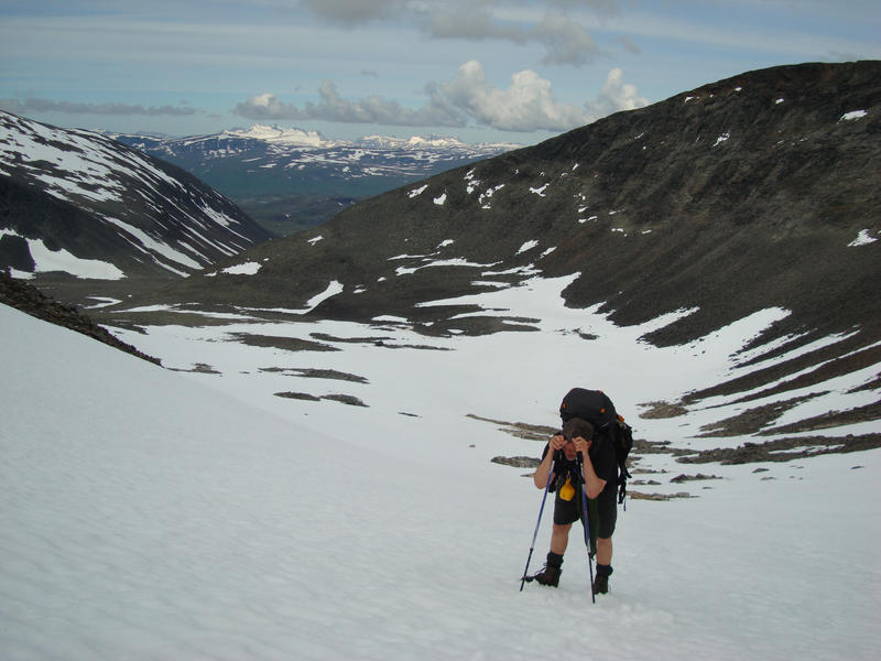 Efter lunch på norra sidan av Kuoperjavrrit bar det av mot nästa pass. Jag blev mycket förvånad över att denna stigning gick så pass lätt. Möjligen berodde det på att vi redan i denna stigning kom på bästa sättet att ta oss uppför branterna. Istället för att välja lätta men lite längre vägar började vi gå kortast möjliga väg, även om den var brant. Vi upptäckte att trots att vi var tvungna att rasta oftare, så blev den totala klättertiden kortare. Även orken höll i längre med denna metod.