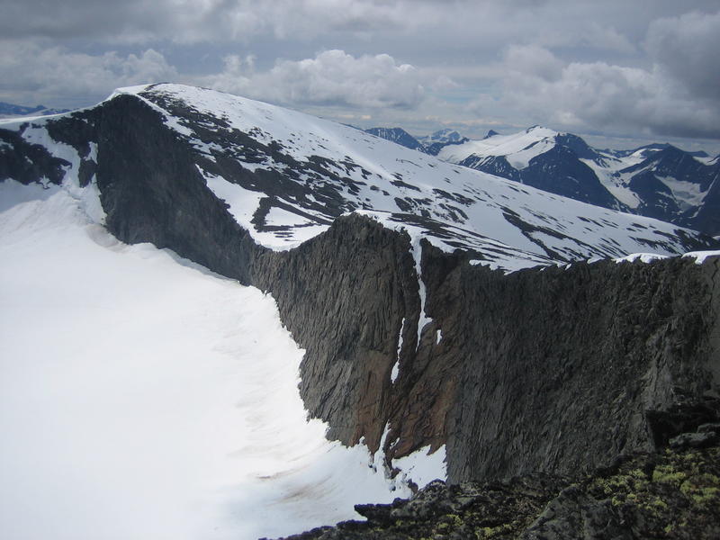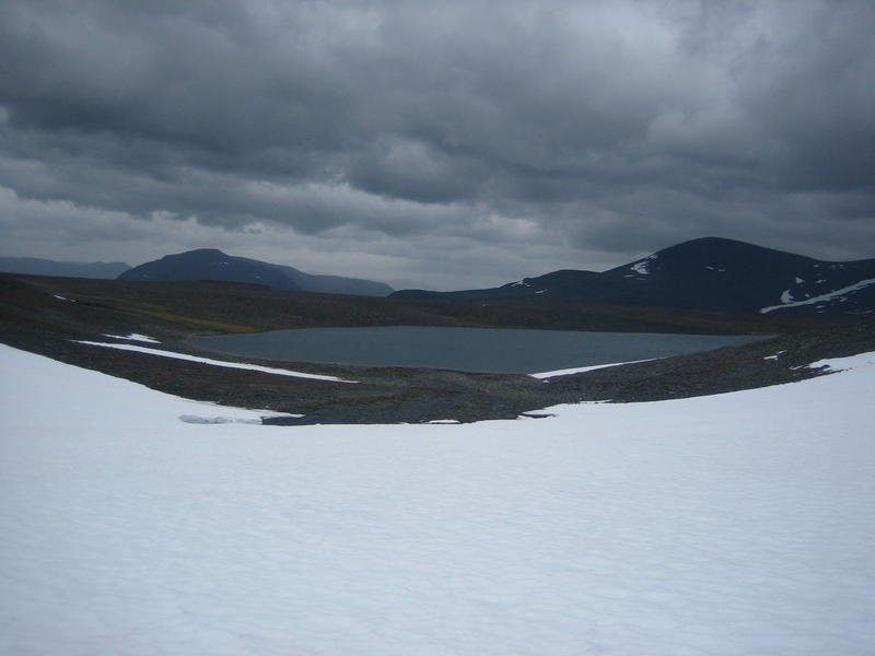 På vägen såg vi att nu var det sämre väder i antågande. Tillfälligt trodde vi, för vi kunde se ljusare himmel bortom de låga moln som ganska hastigt närmade sig. Väl uppe på toppen skyndade vi vidare, för nu var molnen nära. Den tänkta vägen ner skulle gå via bergskammen rakt österut och sedan skulle vi vika av aningen norrut för att skråa ner till sjön 1304 på Skadnjalákku. Vi skulle absolut inte vika söderut, för där väntade otäcka branter. I stort sett hela promenaden ner till sjön skulle äga rum på snö, det hade vi sett tidigare.