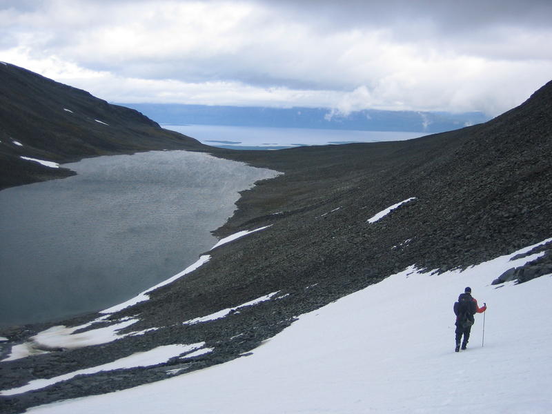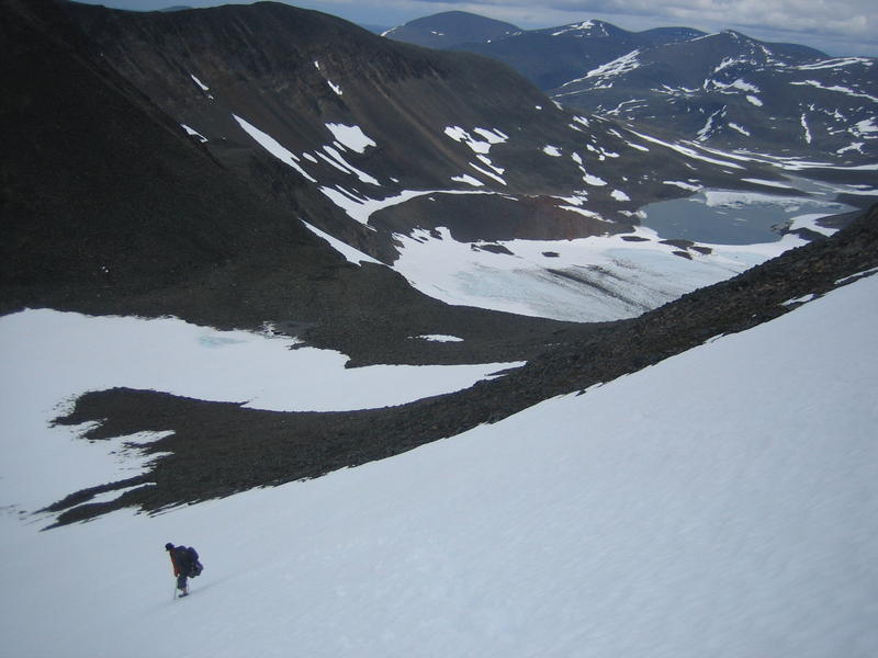 Nedfärden i Kuopervagge gick galant med hjälp av en del snöfält. Jag är glad över att vi inte tältade här. Det kändes som en ganska ogästvänlig plats och det hade nog gått åt en hel del tid att hitta en acceptabel tältplats.