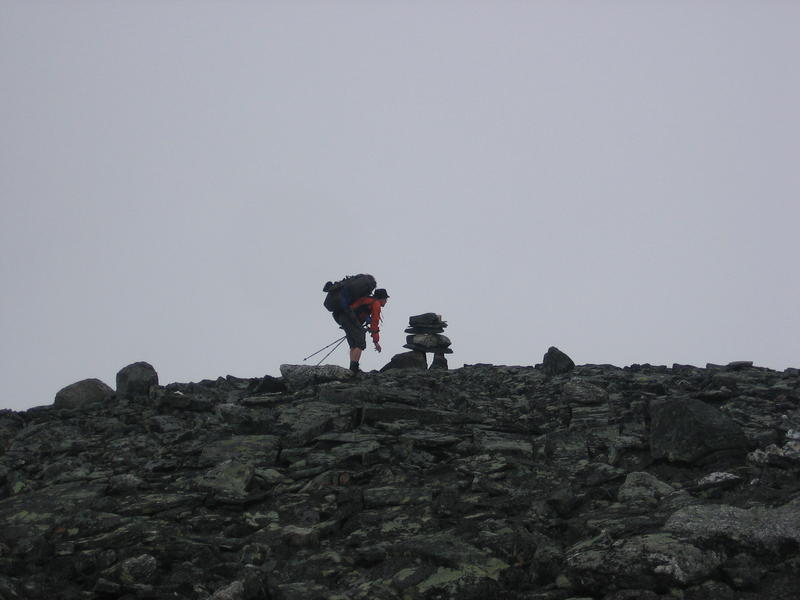 Vi hade inte hunnit långt innan det sämre vädret återkom med förnyad kraft. Det blåste ganska hårt och regnet piskade rejält när vi påbörjade klättringen upp mot det första passet i Trepassleden - den så omtalade. Vandringen blev både tung och slipprig och tog betydligt mycket längre tid än vi planerat. På passets högsta topp vände vinden och bättre väder lät oss ta del av utsikten åt båda håll.